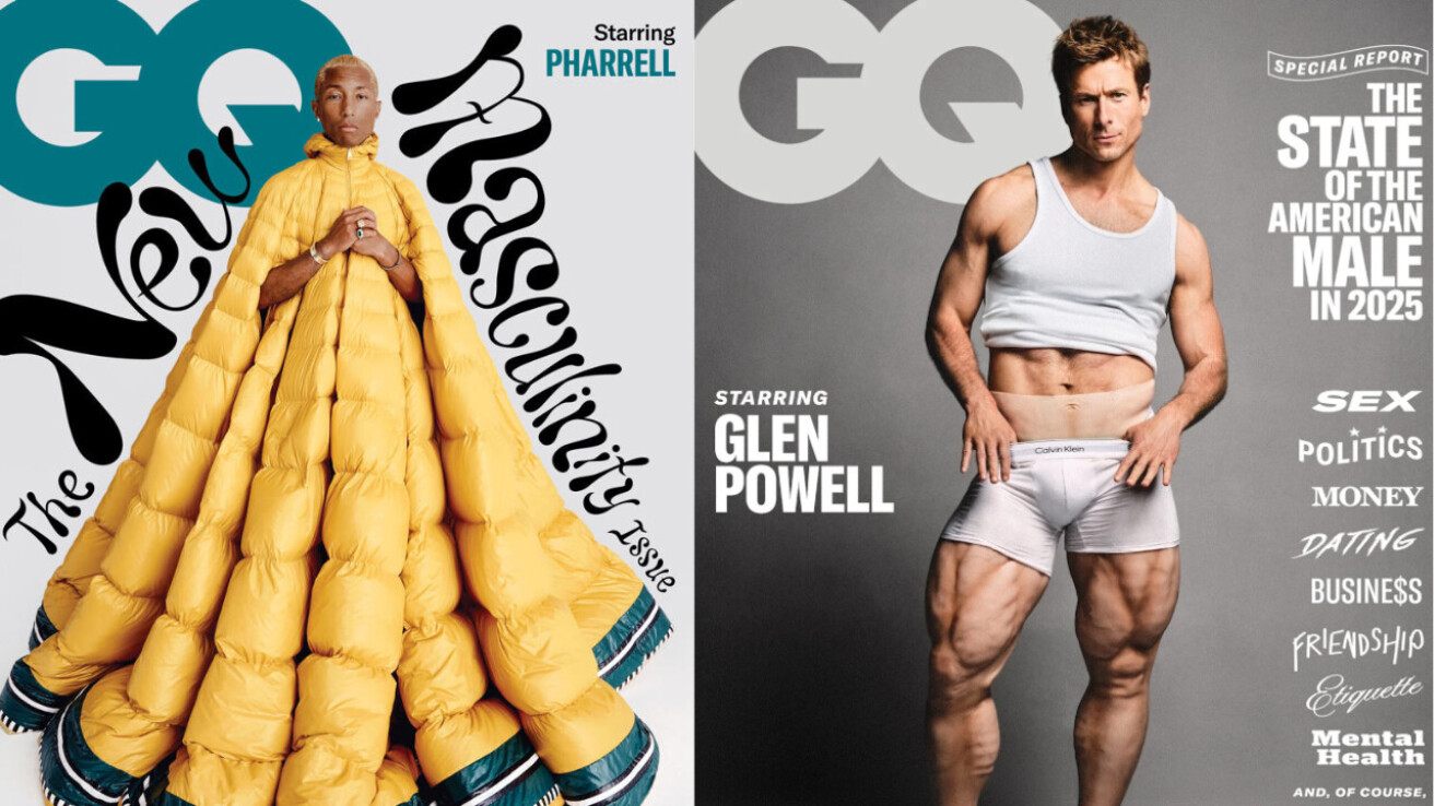 Here we are in 2025 and GQ is back at it with another “State of Masculinity” survey. This time it’s Glen Powell on the cover in a muscle suit (Hollywood’s idea of strength), because the same magazine that bent the knee to woke culture and told us to soften up in 2019 (and put Pharrell on the cover in a yellow dress) now thinks flexing and putting a jacked guy on the cover having fun will sell ads because the cultural winds have shifted back. What wimps.